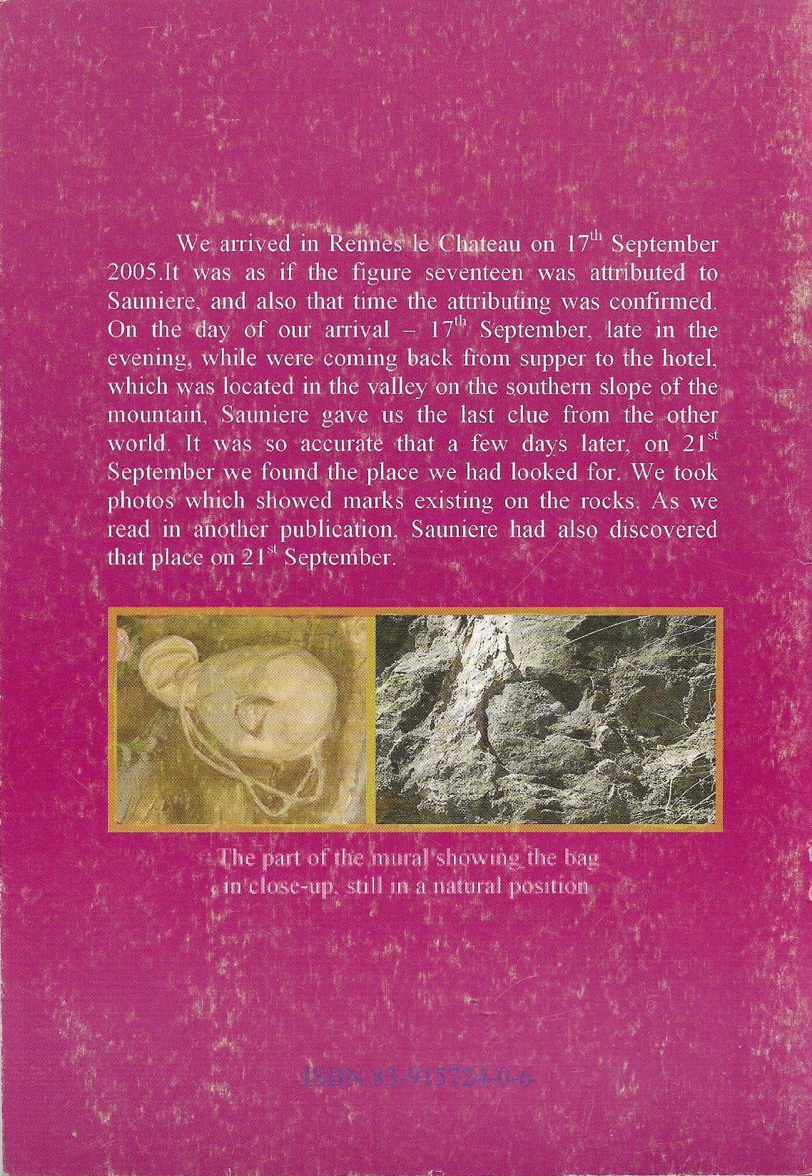 We arrived in Rennes-le-Château on 17th September 2005. It was as if the figure seventeen was attributed to Saunière, and also that time the attributing was confirmed. On the day of our arrival - 17th September, late in the evening, while were coming back from supper to the hotel, which was located in the valley on the southern slope of the mountain, Saunière gave us the last clue from the other world. It was so accurate that a few days later, on 21st September we found the place we had looked for. We took photos which showed marks existing on the rocks. As we read in another publication, Saunière had also discovered that place on 21st September.