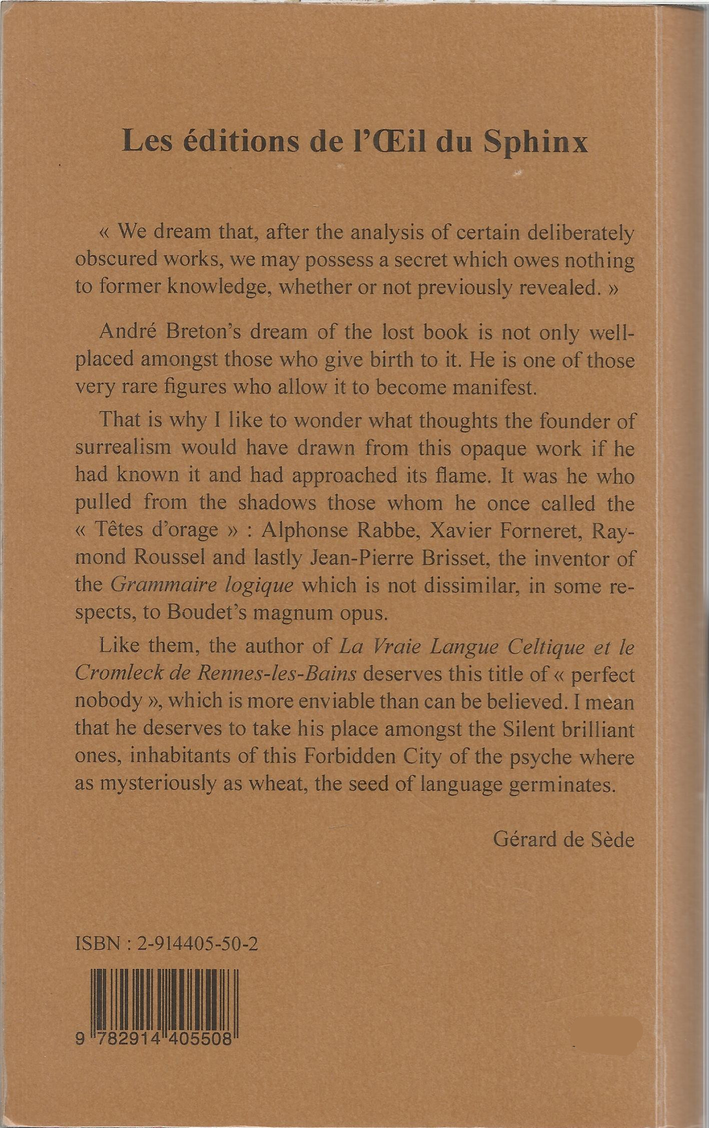Like them, the author of La Vraie Langue Celtique et le Cromleck de Rennes-les-Bains deserves this title of « perfect nobody », which is more enviable than can be believed. I mean that he deserves to take his place amongst the Silent brilliant ones, inhabitants of this Forbidden City of the psyche where as mysteriously as wheat, the seed of language germinates.