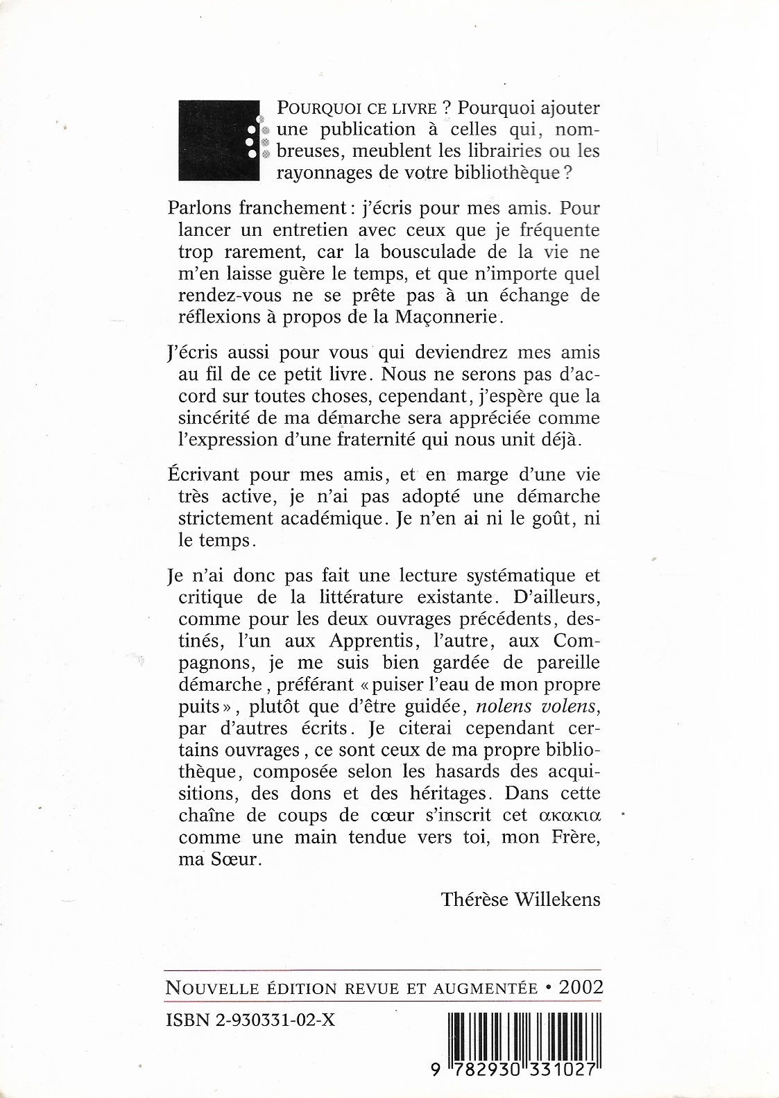 Je n'ai donc pas fait une lecture systématique et critique de la littérature existante. D'ailleurs, comme pour les deux ouvrages précédents, destinés l'un aux Apprentis, l'autre aux Compagnons, je me suis bien gardée de pareille démarche, préférant « puiser l'eau de mon propre puits », plutôt que d'être guidée, nolens volens, par d'autres écrits. Je citerai cependant certains ouvrages, ceux de ma propre bibliothèque, composée selon les hasards des acquisitions, des dons et des héritages. Dans cette chaîne de coups de cœur s'inscrit cet akakia comme une main tendue vers toi, mon Frère, ma Sœur.