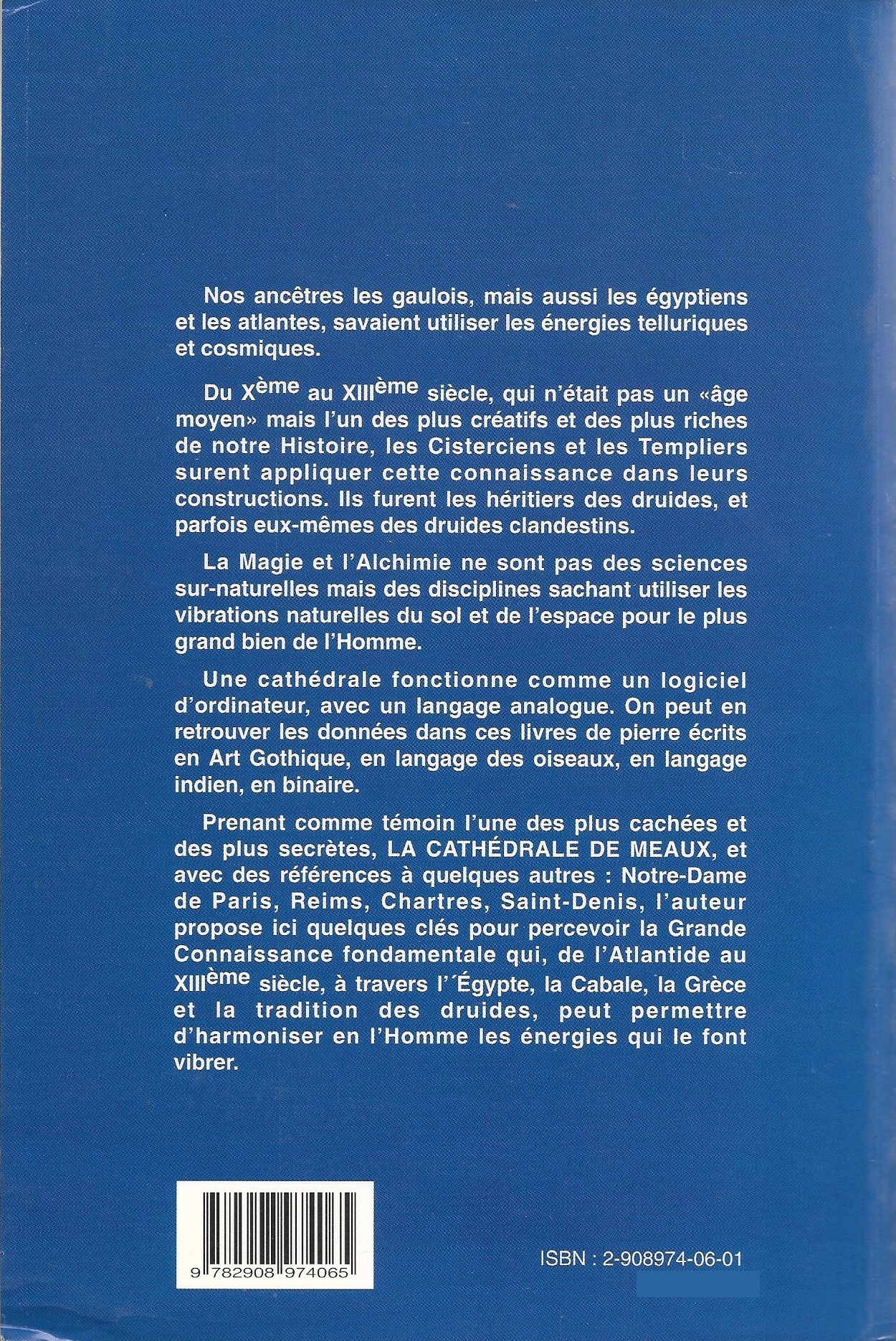 Prenant comme témoin l'une des plus cachées et des plus secrètes, la cathédrale de Meaux, et avec des références à quelques autres : Notre-Dame de Paris, Reims, Chartres, Saint-Denis, l'auteur propose ici quelques clés pour percevoir la Grande Connaissance fondamentale qui, de l'Atlantide au XIIIe siècle, à travers l'Égypte, la Cabale, la Grèce, et la tradition des druides, peut permettre d'harmoniser en l'Homme les énergies qui le font vibrer.