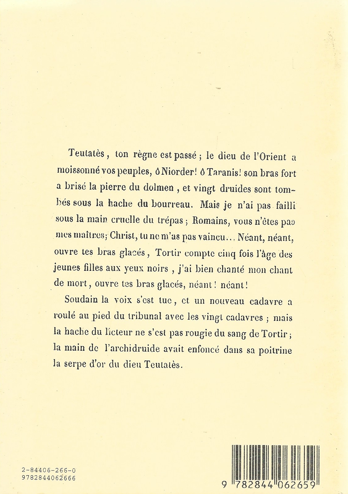 Teutatès, ton règne est passé ; le dieu de l'Orient a moissonné vos peuples, ô Niorder ! ô Taranis ! son bras fort a brisé la pierre du dolmen, et vingt druides sont tombés sous la hache du bourreau. Mais je n'ai pas failli sous la main cruelle du trépas ; Romains, vous n'êtes pas mes maîtres ; Christ, tu ne m'as pas vaincu... Néant, néant, ouvre tes bras glacés, Tortir compte cinq fois l'âge des jeunes filles aux yeux noirs, j'ai bien chanté mon chant de mort, ouvre tes bras glacés, néant ! néant !