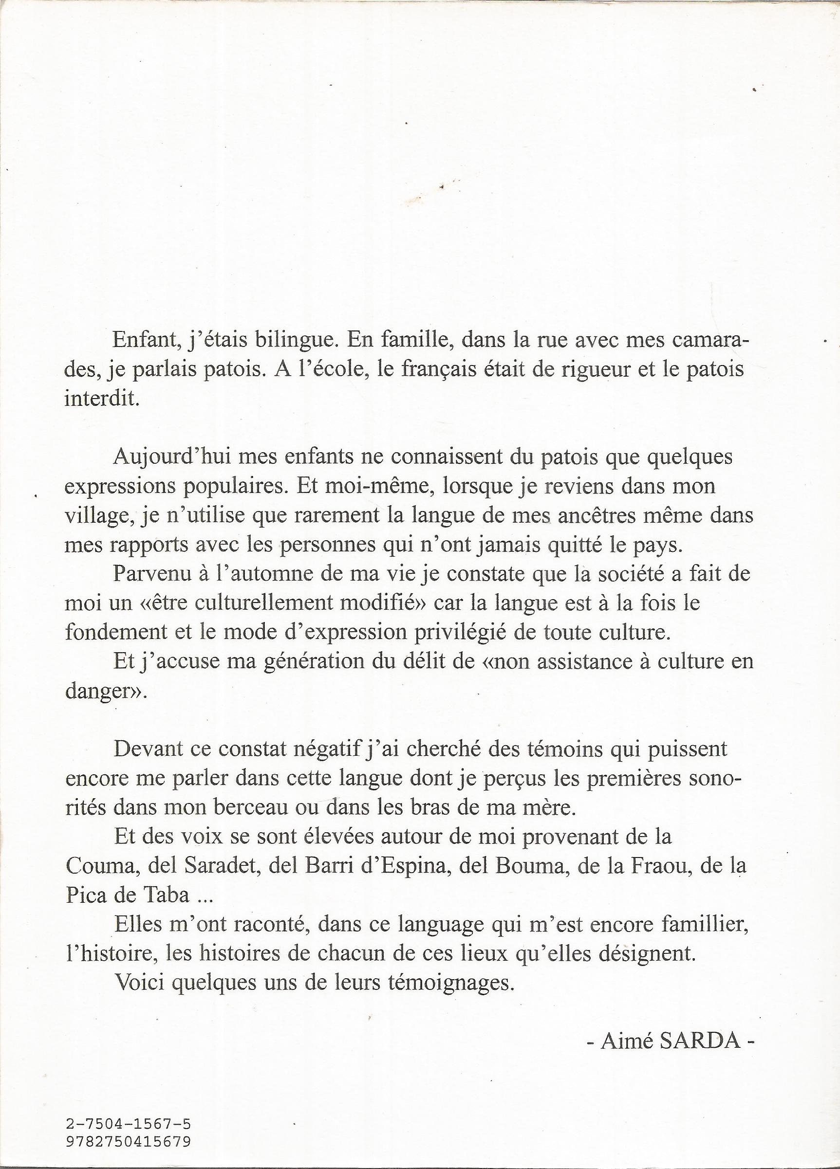 Aujourd'hui mes enfants ne connaissent du patois que quelques expressions populaires. Et moi-même, lorsque je reviens dans mon village, je n'utilise que rarement la langue de mes ancêtres même dans mes rapports avec les personnes qui n'ont jamais quitté le pays.