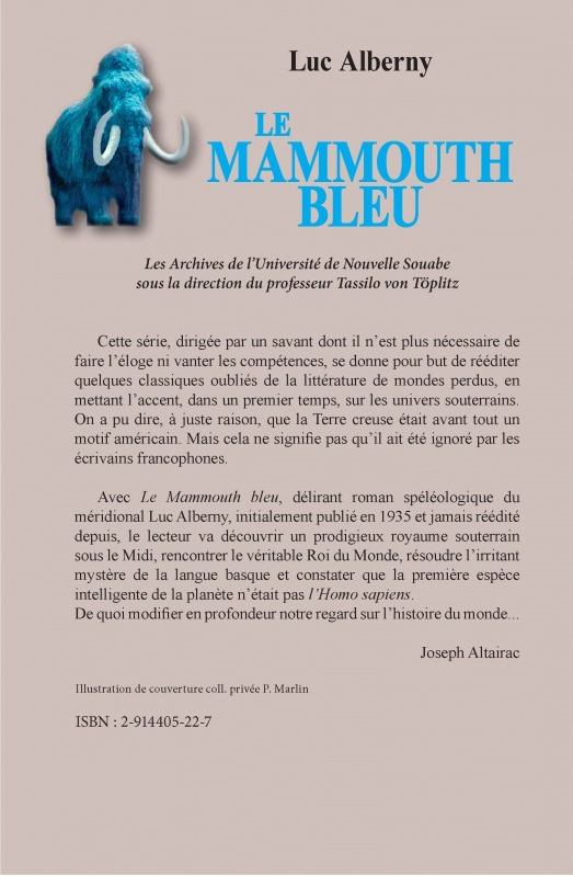 Avec Le Mammouth bleu. délirant roman spéléologique du méridional Luc Alberny, initialement publié en 1935 et jamais réédité depuis, le lecteur va découvrir un prodigieux royaume souterrain sous le Midi, rencontrer le véritable Roi du Monde, résoudre l'irritant mystère de la langue basque et constater que la première espèce intelligente de la planète n'était pas l'Homo sapiens.