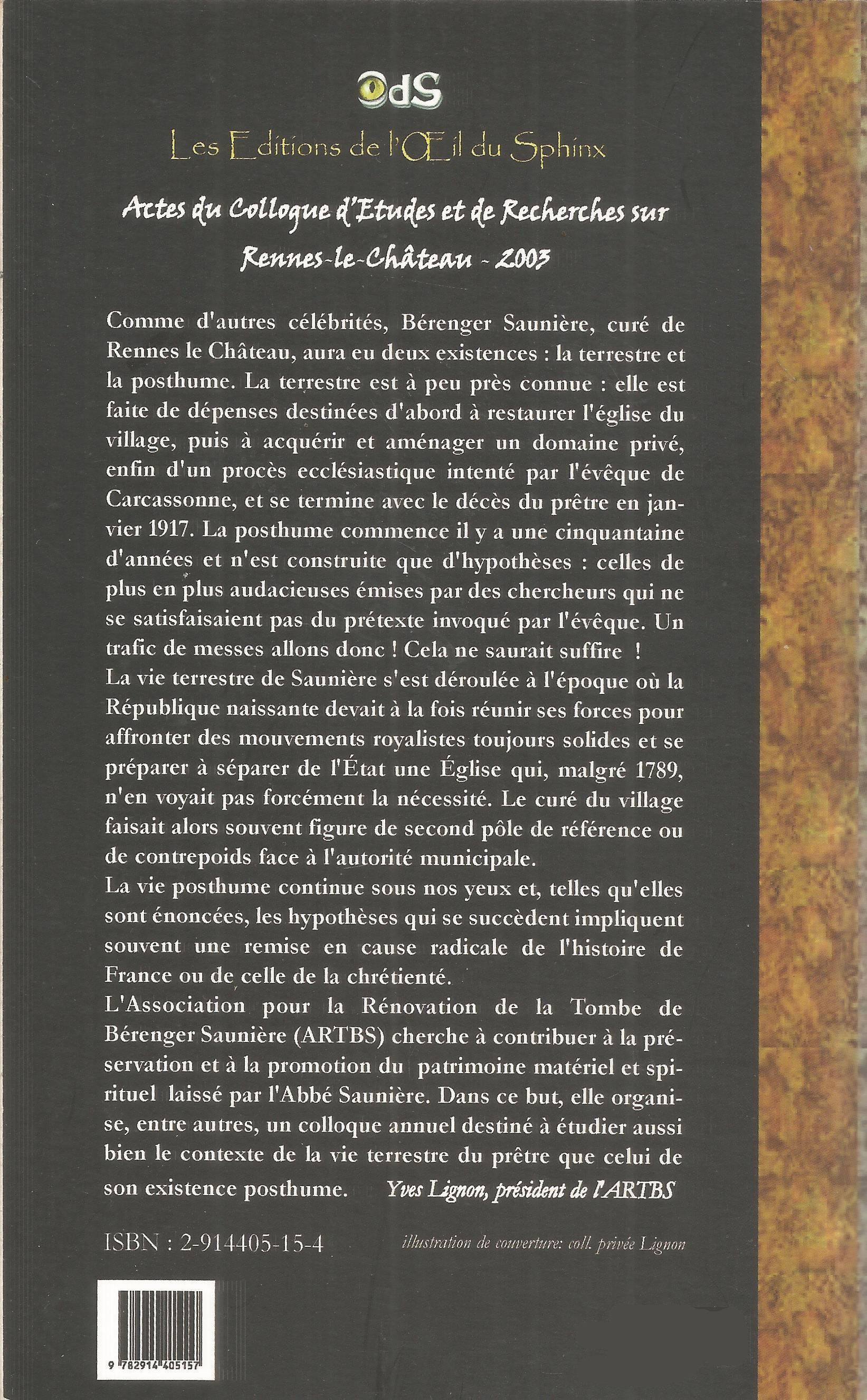 Comme d'autres célébrités, Bérenger Saunière, curé de Rennes le Château, aura eu deux existences : la terrestre et la posthume. La terrestre est à peu près connue : elle est faite de dépenses destinées d'abord à restaurer l'église du village, puis à acquérir et aménager un domaine privé, enfin d'un procès ecclésiastique intenté par l'évêque de Carcassonne, et se termine avec le décès du prêtre en janvier 1917. La posthume commence il y a une cinquantaine d'années et n'est construite que d'hypothèses : celles de plus en plus audacieuses émises par des chercheurs qui ne se satisfaisaient pas du prétexte invoqué par l'évêque. Un trafic de messes allons donc ! Cela ne saurait suffire !