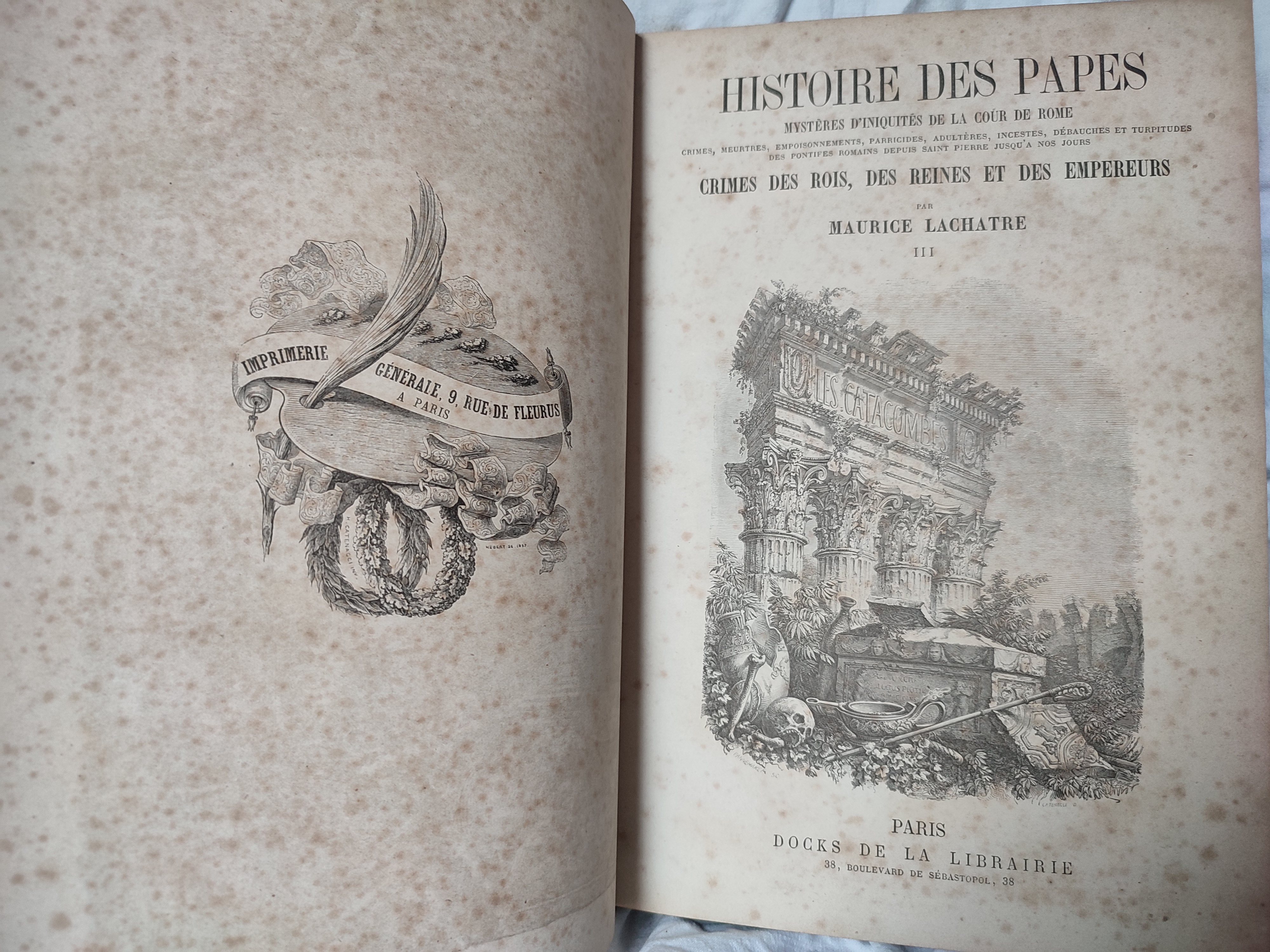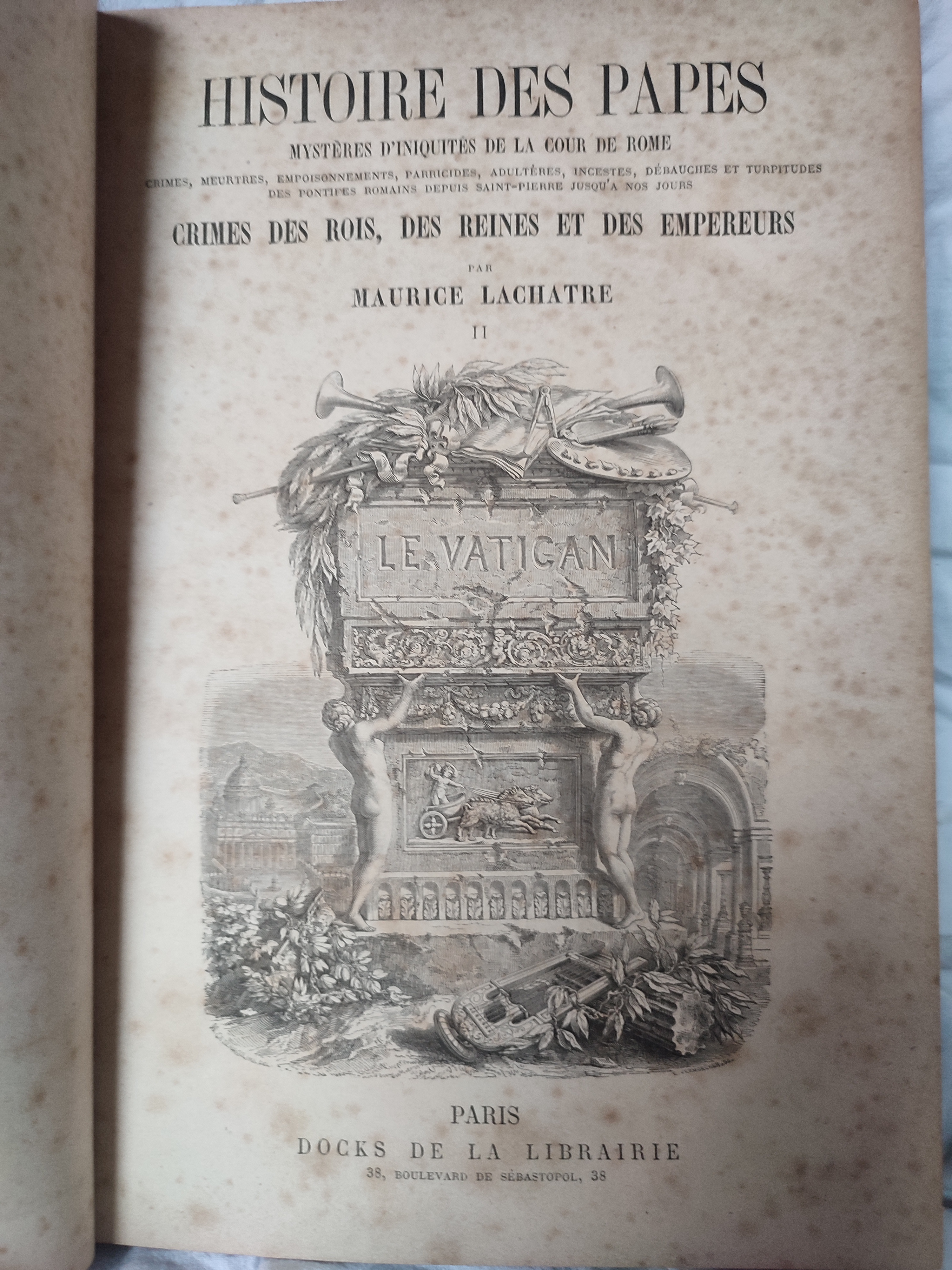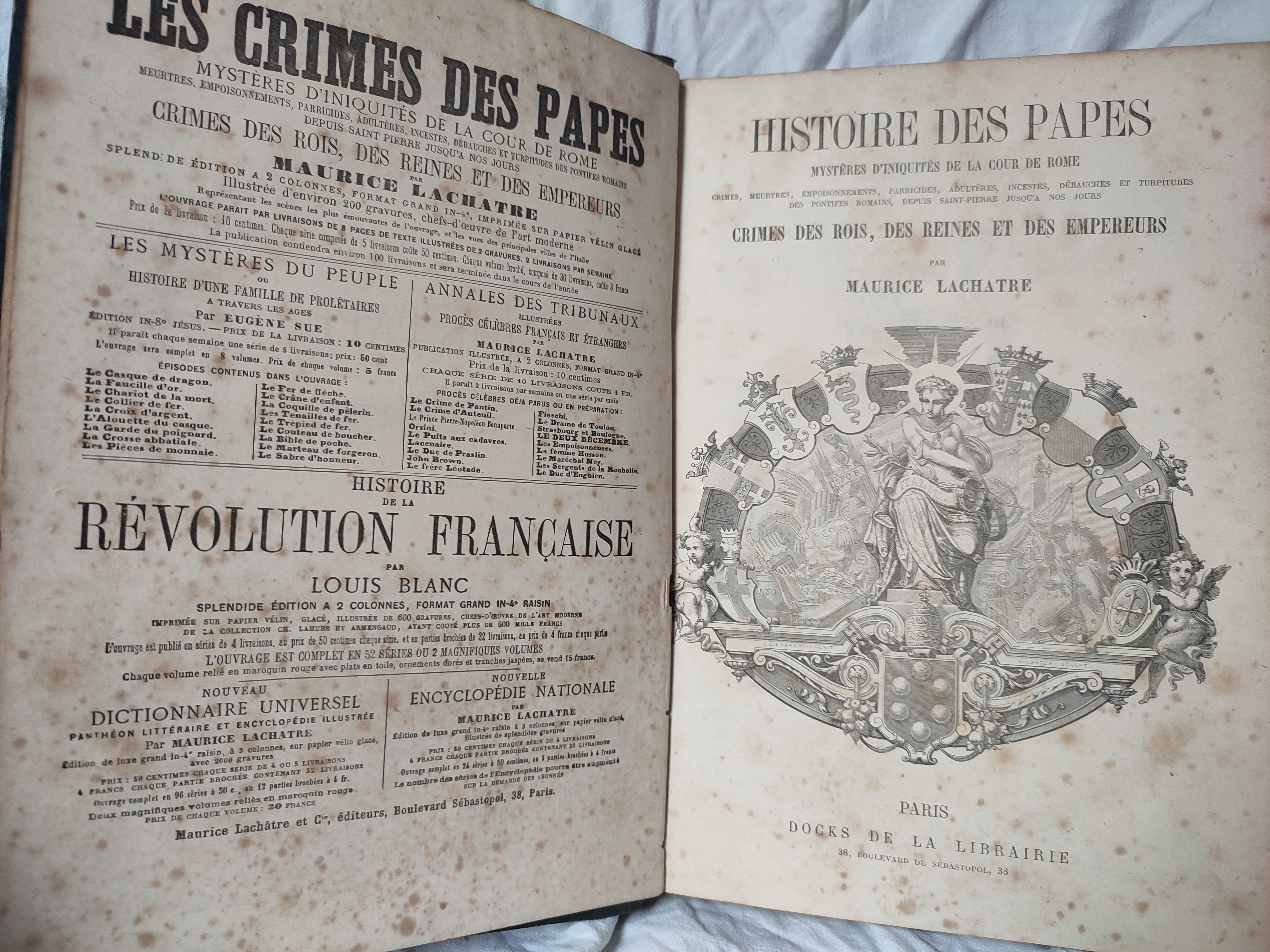 Bien complet des trois tomes sur l'Histoire des papes. Contient in fine les 80 premières pages de l'Histoire du Consulat et de l'Empire de Maurice Lachatre (Bonaparte, Napoléon Ier, Louis XVIII).
