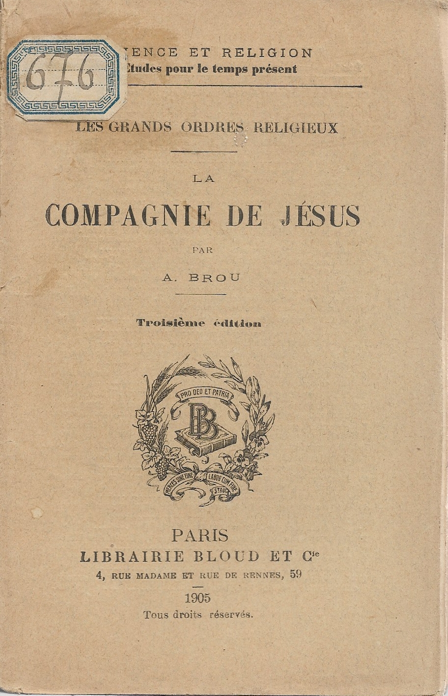 De A. Brou. Paris, Librairie Bloud et Cie, 1905, 64 p.