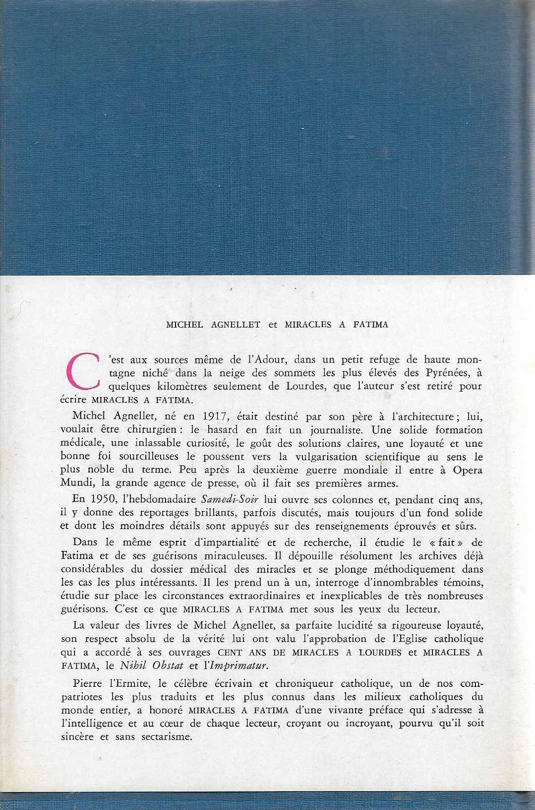 Cette tâche, relativement facile à Lourdes, où fonctionne depuis les premières années le Bureau des constatations Médicales, est particulièrement ardue à Fatima où rien de semblable n'existe. En écrivant ceci, nous ne prononçons pas une critique car dans l'esprit de l'Église, Fatima n'est pas et ne sera jamais la clinique miraculeuse du corps matériel, mais la clinique de l'âme, l'ardent foyer où brûle la flamme de la rédemption du Monde par la prière, le berceau, peut-être, du sauvetage de notre civilisation face au danger dévorant du totalitarisme.