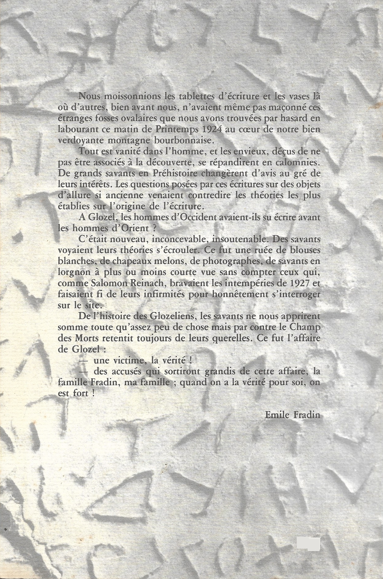 De l'histoire des Glozeliens, les savants ne nous apprirent somme toute qu'assez peu de chose mais par contre le Champ des Morts retentit toujours de leurs querelles. Ce fut l'affaire de Glozel :