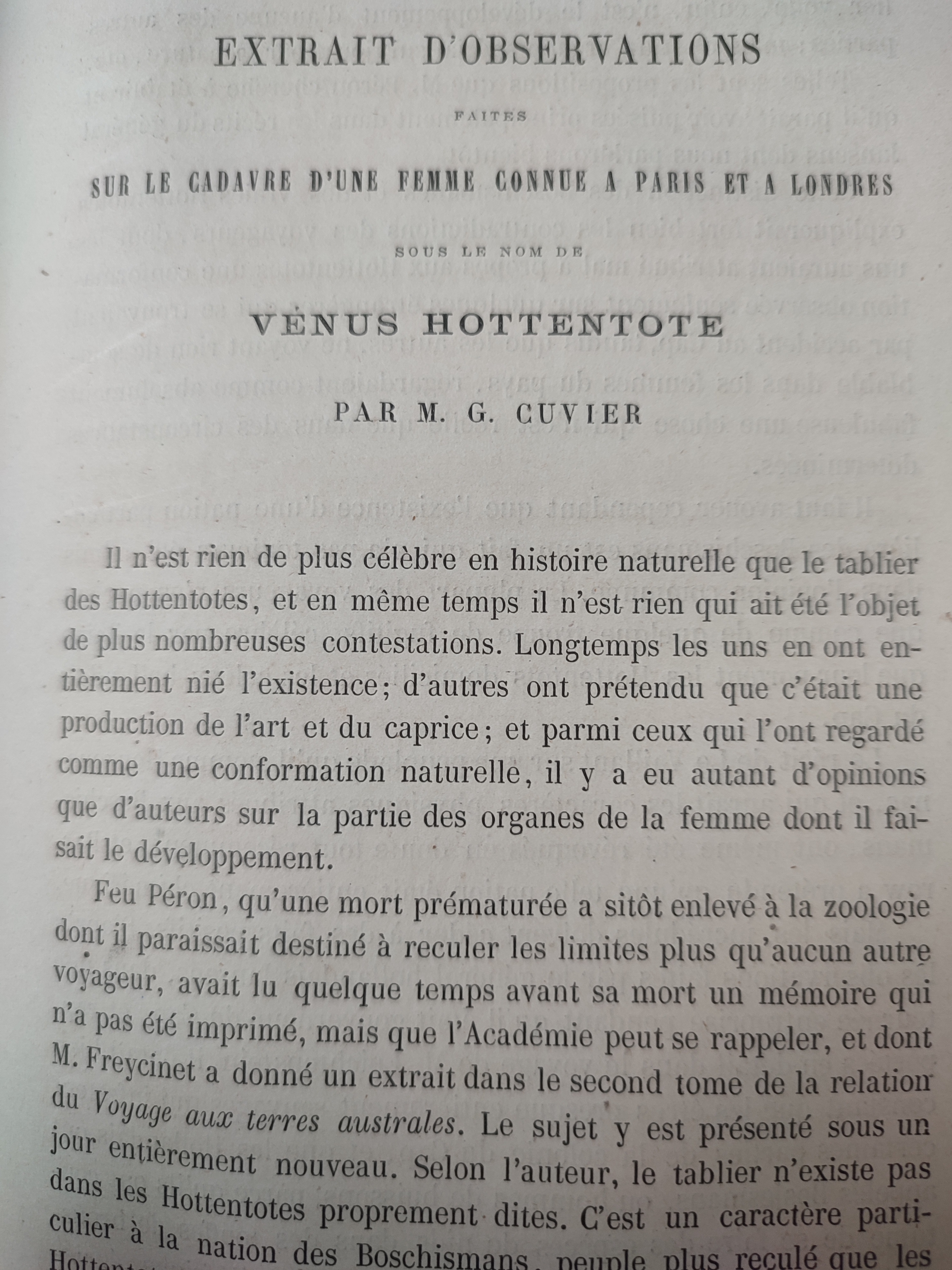 Extrait d'observations faites sur le cadavre d'une femme connue à Paris et à Londres sous le nom de Vénus Hottentote