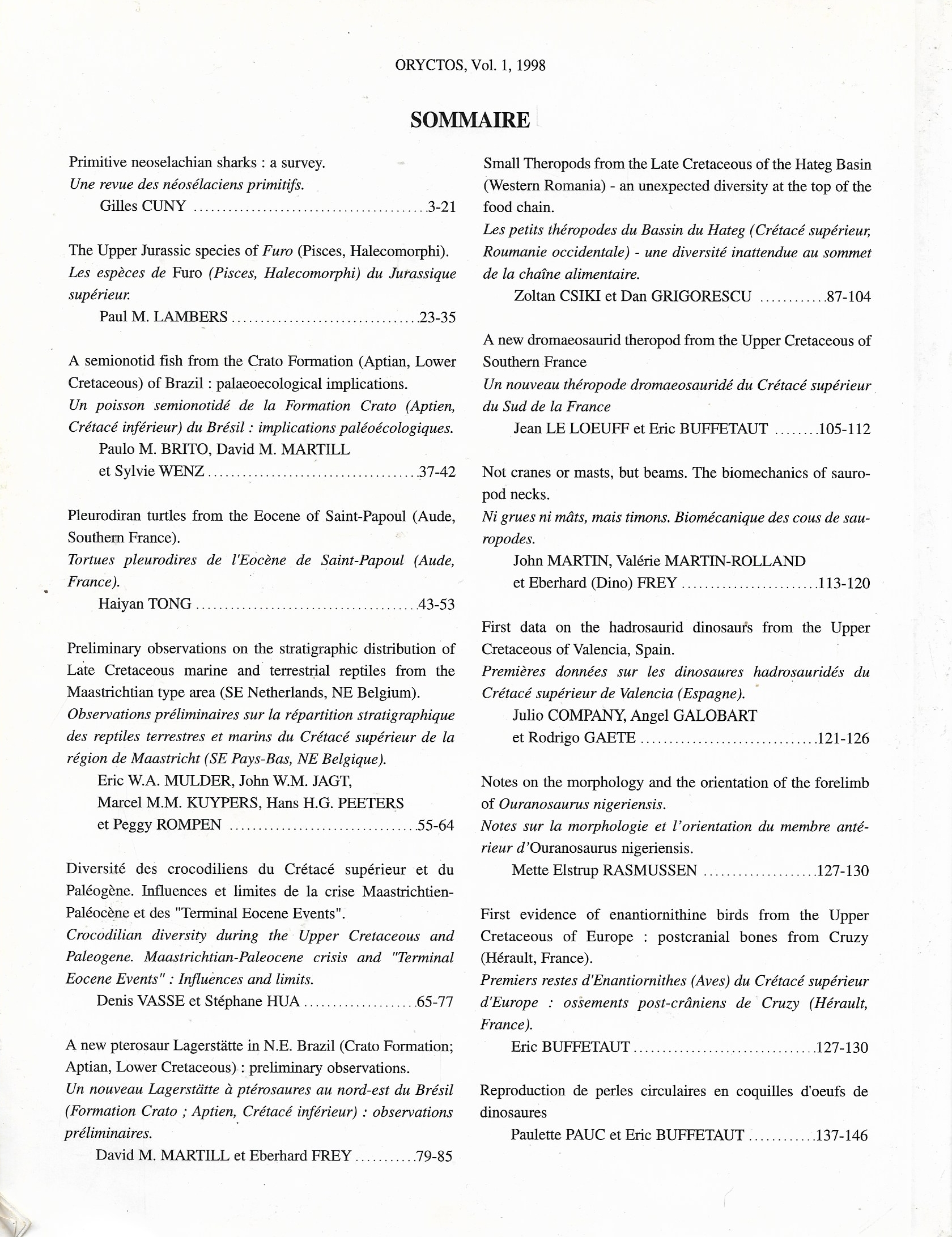 Ce premier volume d'Oryctos est consacré à la publication des actes du Deuxième Congrès Européen de Paléontologie des Vertébrés (Second European Workshop of Vertebrate Palaeontology), qui s'est tenu à Espéraza et à Quillan du 6 au 10 mai 1997.
